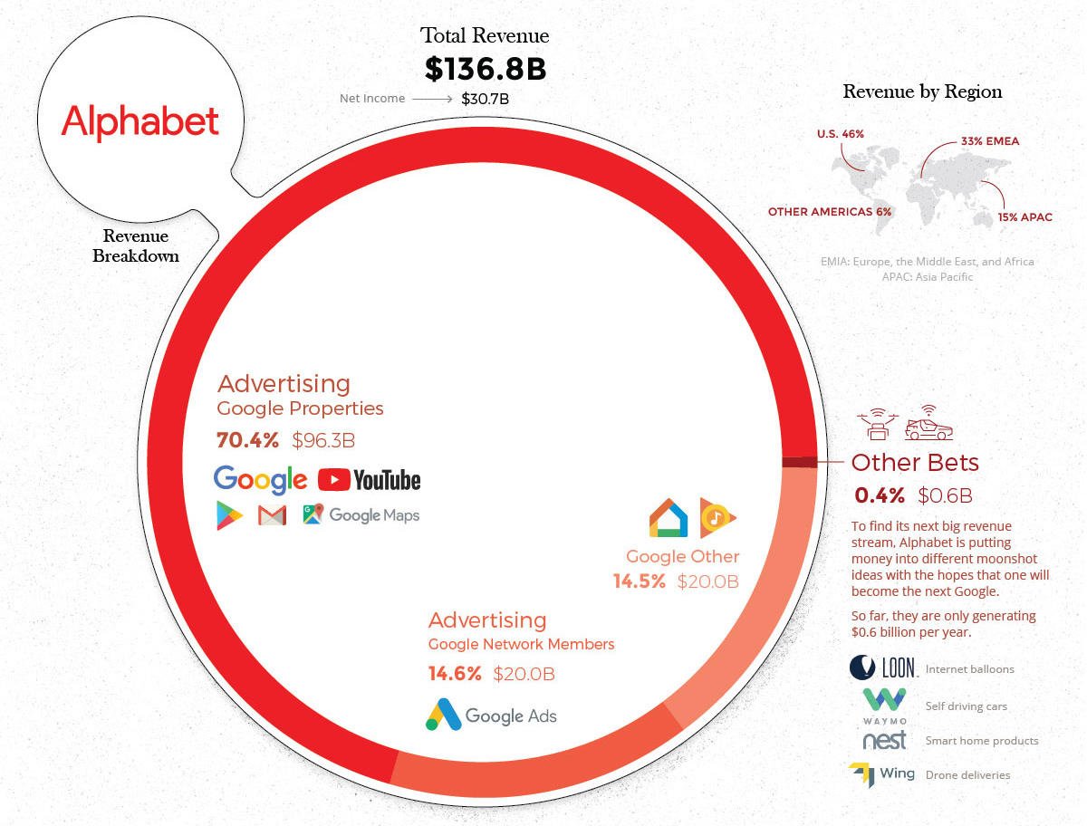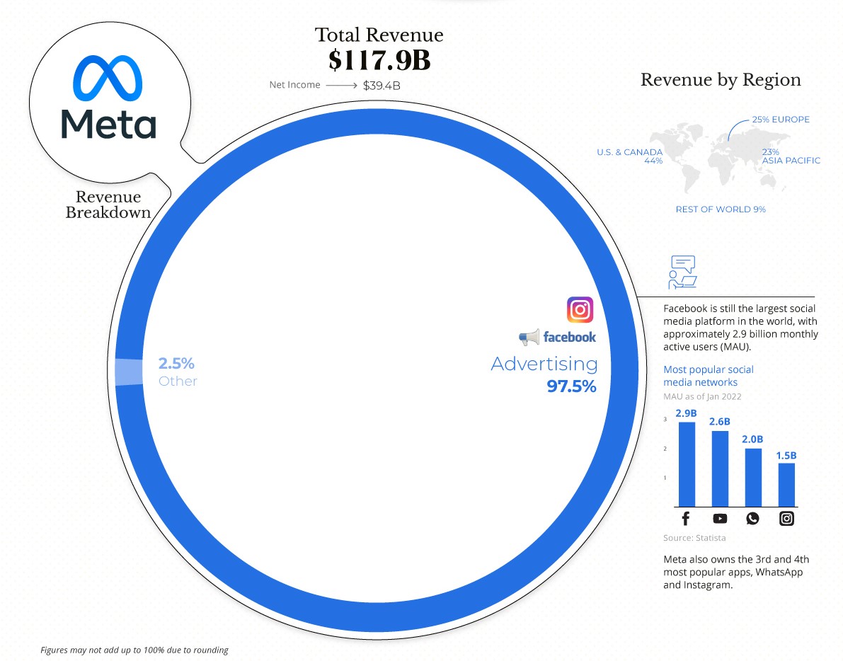 Esta empresa con sus servicios Facebook, Instagram y WhatsApp, todos «gratuitos», en el año 2018 empleaba a más de 35.000 personas (en 2021 esta cifra ha aumentado hasta los 71.000 empleados) y obtuvo unos ingresos por valor de 55.838 mil millones de dólares de los cuales 24.913 mil millones de dólares fue el beneficio neto de explotación.