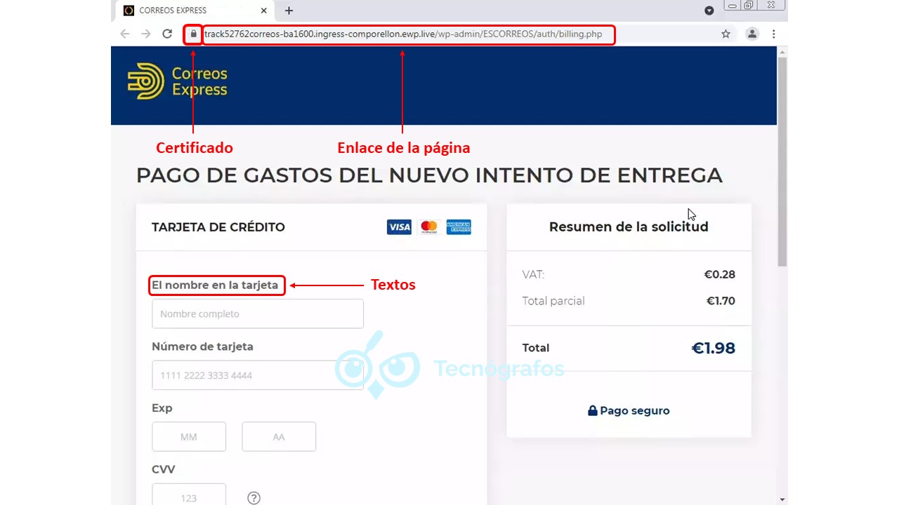 En primer lugar, nos debería parece extraño que desde un SMS nos lleve directamente a una página de pago. No es la forma de proceder en estas empresas. Además, en la página, no vemos por ningún sitio nuestro número de pedido. Este detalle es bastante indicativo, puesto que vamos a pagar algo sin que se nos indique mediante un número de pedido, seguimiento o algún tipo de identificador, que es nuestro paquete.