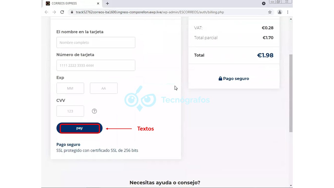Otro error en los textos lo encontramos en el botón de pagar, al que le han puesto «pay«, cuando toda la página está traducida al español.