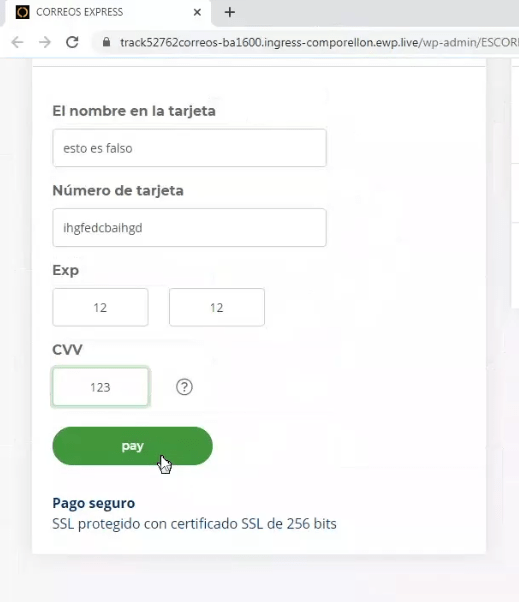 Si llegados a este punto introducimos nuestros datos en esta página… estamos perdidos, puesto que le acabamos de entregar al atacante nuestra tarjeta de débito o crédito. Como estaba en un entorno de pruebas metí datos falsos para ver hasta dónde llegaba la estafa y pulsé sobre «pay«.