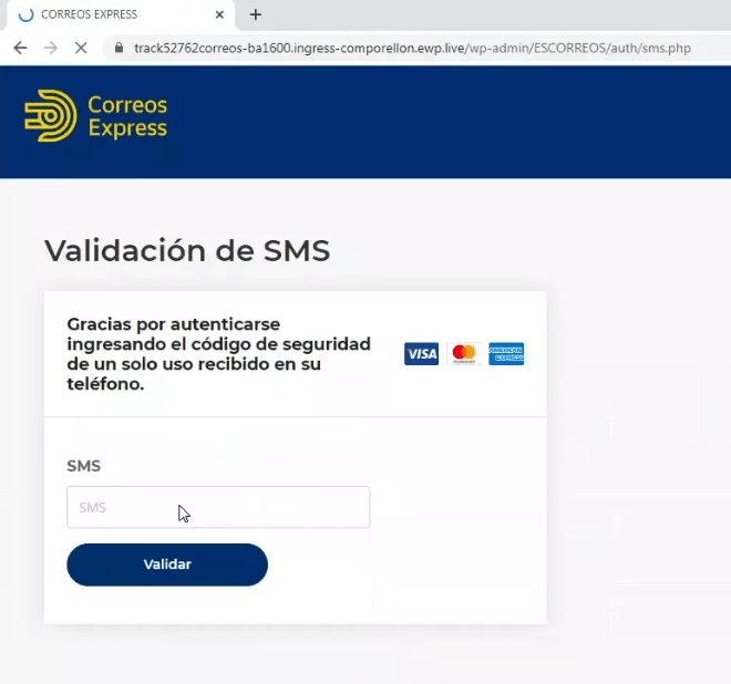 La siguiente página que me muestra a continuación era para validar el pago mediante un SMS. Obviamente como se trata de una estafa ese SMS nunca me iba a llegar. En esa página al introducir cualquier número y pulsando en «Validar» nos redirige continuamente a la misma página de validación. Un bucle infinito demostrando, una vez más, que es una estafa.