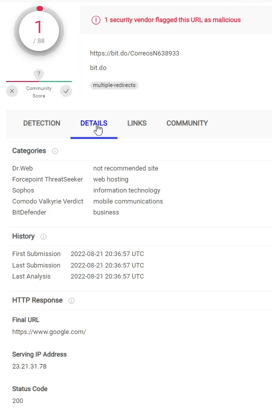 Si sigues teniendo dudas sobre un enlace utiliza alguna herramienta que ayude a deducir si es fraudulento o no, como por ejemplo Virus Total. Con esta herramienta solo tienes que pegar la URL sospechosa y darle a analizar. La página comprobará con más de 30 motores de antivirus si el enlace que has introducido es malicioso. En el escenario anterior 1 motor de antivirus detectó la página como fraudulenta, como puedes ver en la siguiente imagen: