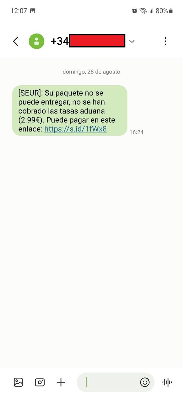Este verano ha habido una campaña de smishing real, en el que el atacante se hace pasar por una conocida empresa pública de mensajería española, Correos (también te muestro un SMS de otra campaña real con la empresa de paquetería SEUR). El ataque comienza cuando el usuario recibe un SMS como los que te muestro a continuación: